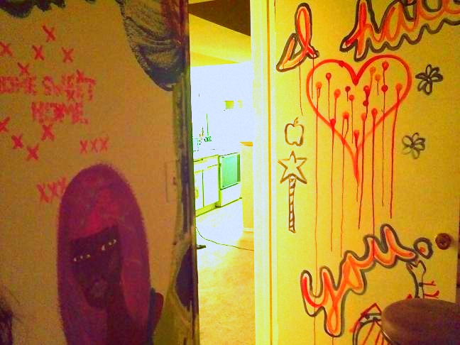 So for my project, I decided to paint the walls of my room. I did this over night one night and stayed up until about 5 am. I like to invite friends to come over and paint with me, and leave a little mark of theirs on the wall in my room. It's so cool so see all different types of drawings and paintings and words and objects. I absolutely love it.